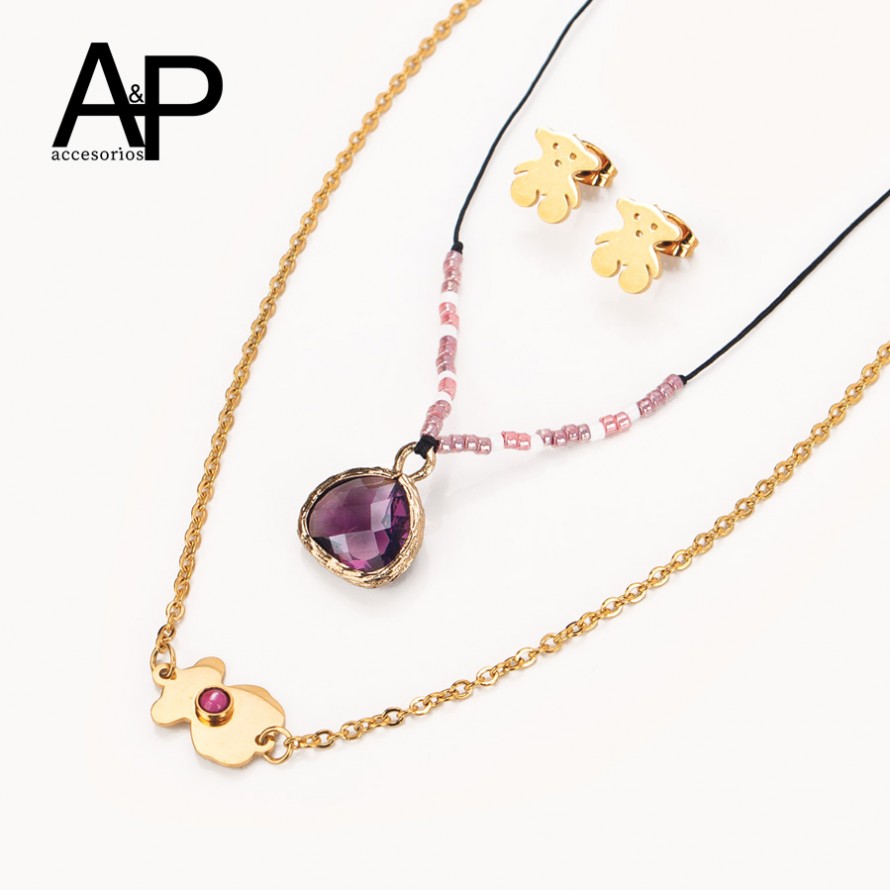 RG047- JUEGO EN ACERO OSOS Y ZIRCON CORAZON MORADO