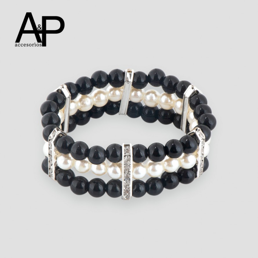 MT223- PULSERA TRIPLE PERLAS NEGRAS Y BLANCAS
