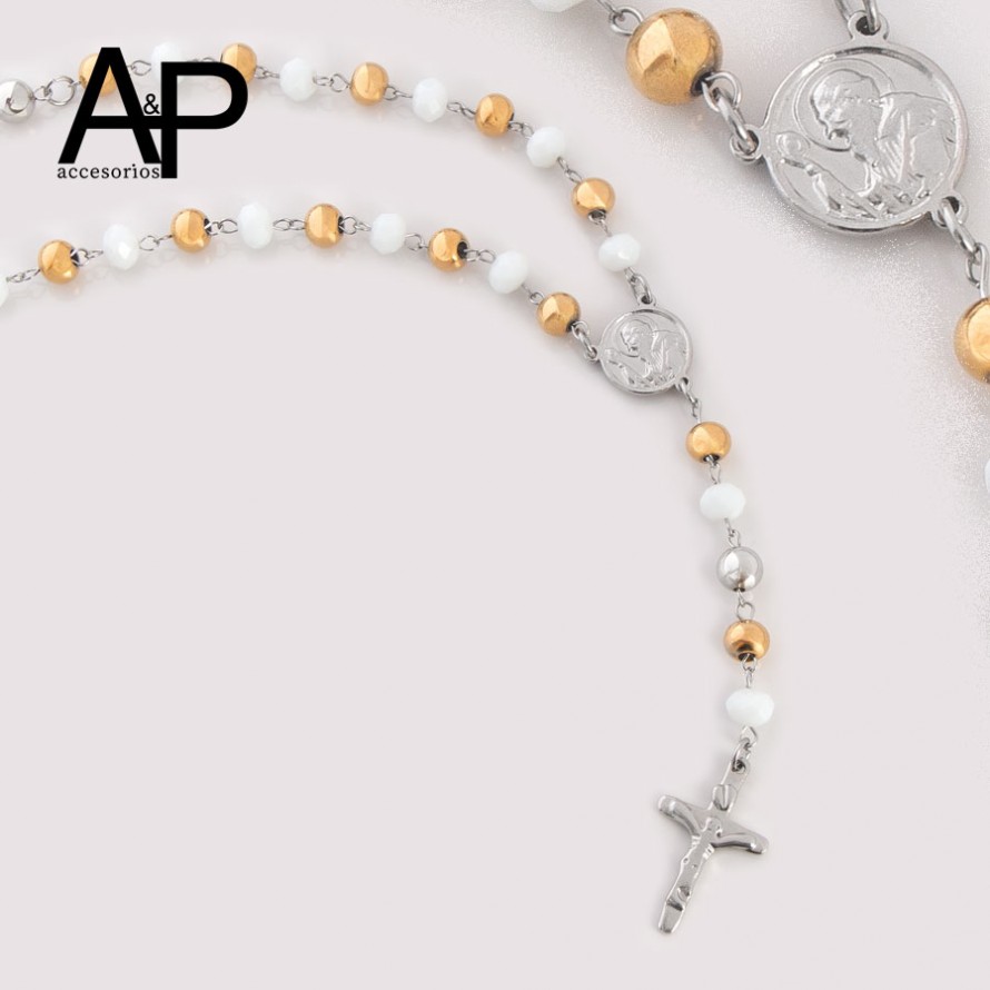 EAP393- ROSARIO EN ACERO BICOLOR CON MURANOS BLANCOS