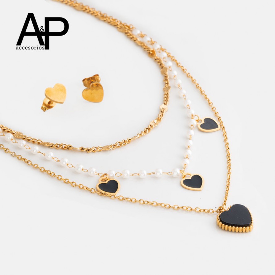 DAP1054- JUEGO TRIPLE PERLITAS,DIJES CORAZONES NEGROS